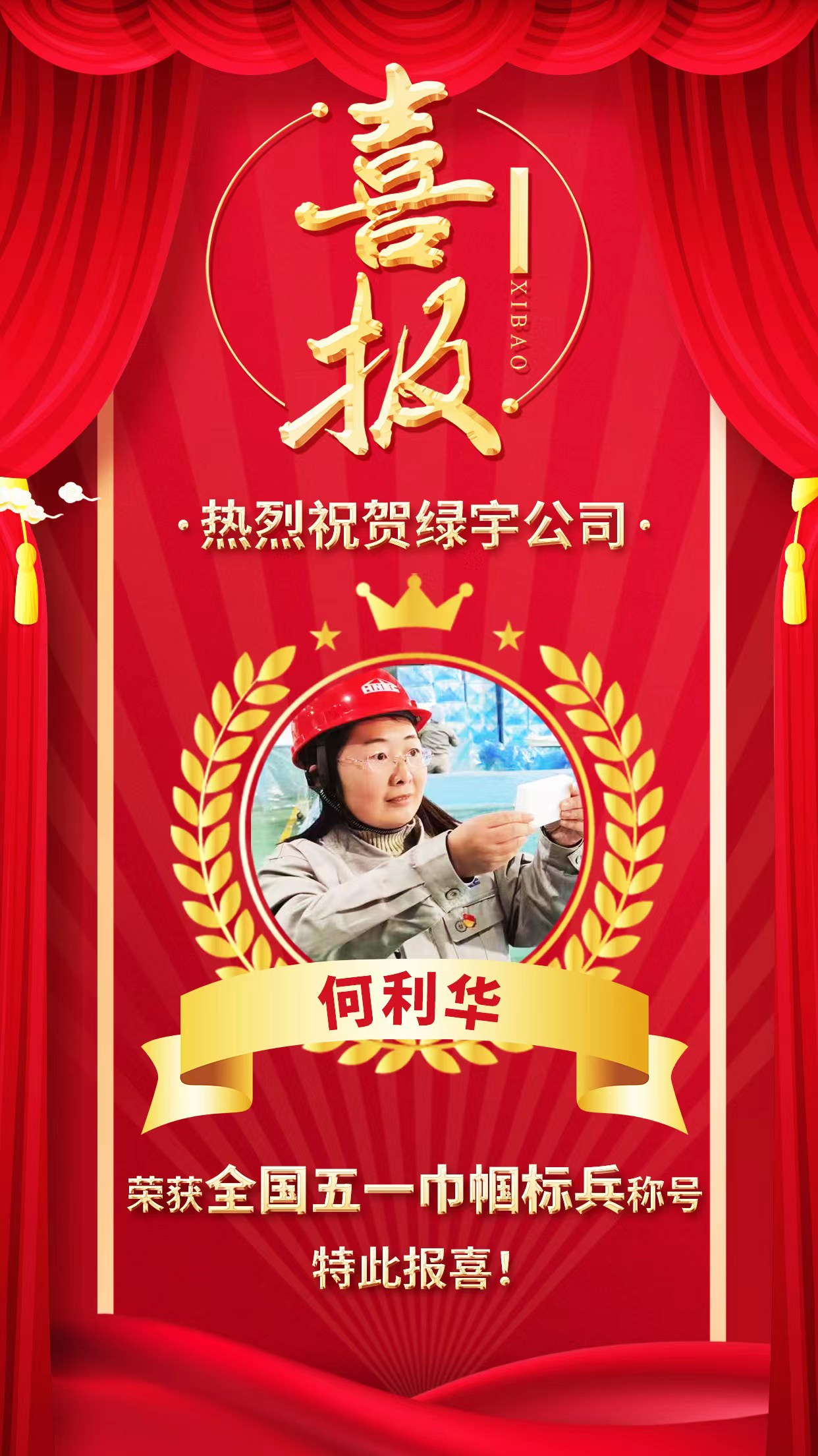 喜報!熱烈祝賀綠宇公司何利華榮獲“全國五一巾幗標兵”稱號